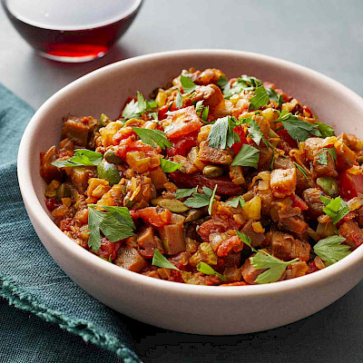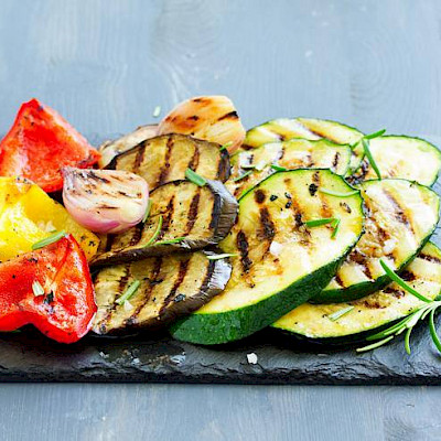 Tris di verdure alla griglia, peperoni, melanzane e zucchine condite con olio, sale, aglio e rosmarino