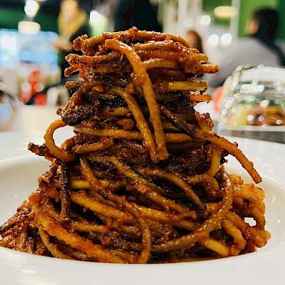 Tipico primo piatto barese, spaghetti piccanti in salsa di pomodoro "bruciati" in padella